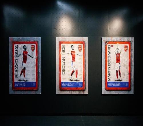球员系列则聚焦于阿森纳故事中个体的力量,是整个展览中最能点燃个人记忆的部分。厄德高的灵光、赖斯的坚毅、萨卡的锋芒,还有传奇队长亚当斯穿越时光而来的铁血风骨,都以充满生命力的方式在画布上奔腾。艺术家的创作并未追求写实肖像,而是捕捉每位球员独一无二的“气场”,通过动作、色彩与动态线条传达情绪印象与精神特质。其中,《收藏品》系列作品的视觉灵感,来源于怀旧风格的交易卡,将阿森纳现役球员与历史上的传奇球员,转化为可收藏的艺术瞬间。